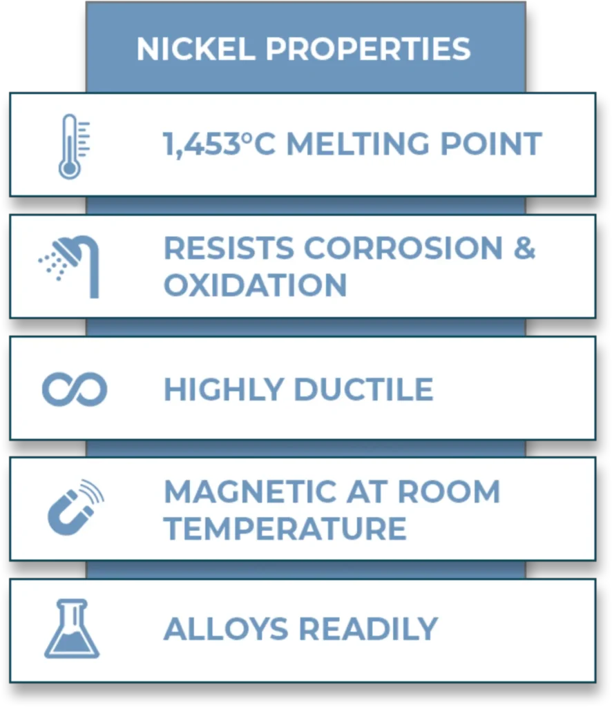 Nickel has outstanding physical and chemical properties, which make it essential in hundreds of thousands of products. Its biggest use is in alloying – particularly with chromium and other metals to produce stainless and heat-resisting steels.[1]