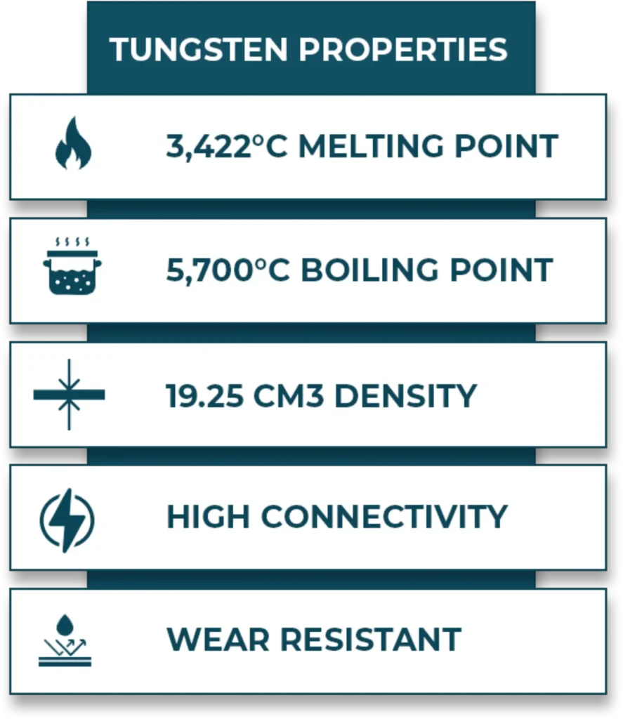 Tungsten has the highest melting point of any metal and very high density making it indispensable for extreme-systems. This ultra‑hard metal is used in aerospace components, advanced chips artillery shells, armor plating and cutting tools; about 60% of U.S. consumption goes into tungsten carbide for industrial applications.[1]
